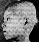 | (epilation, weakness, and malaise); bleeding symptoms (hematemesis, bloody discharge from the bowels, hematuria, nosebleed, gingival bleeding, genital bleeding, and subcuta-neous bleeding); inflammation symptoms (fever, pharyngalgia, stomatitis, and dermatitis); blood symptoms (leukocytopenia and erythrocytopenia); genital organ symptoms (aspermia and menstrual abnormalities). | A girl in hair epliation stage. (2 km from the hypocenter photographed by Shunkichi Kikuchi.) |