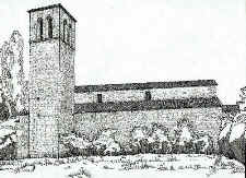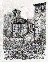 | Da un disegno di M. Foni. Località: Corsano presso la frazione di San Leo nel pian d'Anghiari. Antica chiesa, originariamente dedicata a San Michele Arcangelo, con interessante soluzione di campanile-torre (XII o primi del XIII sec.) nella facciata, con ingresso alla chiesa ricavato nella base di questo. Da notare l'involucro parallelepipedo del campanile che è risolto dall'organizzazione delle bifore e dei settori murari angolari. L'interno a croce latina presenta decorazioni architettoniche e affreschi quattrocenteschi. |
