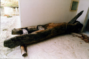 | A ciò si aggiunge unaltra amara riflessione: un sistema di travi antiche, probabilmente usate come mezzo di sbarramento del fiume nel processo di fluitazione,anchesse ritrovate vicino al vecchio ponte, sono state affidate alla benevolenza delle intemperie, appoggiandole davanti allingresso della nuova scuola elementare (nuova sì, ma ormai già soppressa, quindi abbandonata) in località Madonnuccia Nuova. | ![]() |