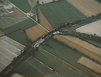 La foto aerea qui proposta non è relativa al lotto 1 bensì alla zona che va verso il confine di provincia. Tale foto ci pare comunque significativa perché evidenzia chiaramente il tipo di paesaggio agrario che consegue al riordino fondiario: un paesaggio molto più geometrico, meno naturale per effetto dellantropizzazione cui è stato sottoposto. |