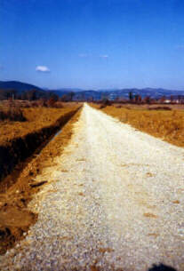 La foto è stata riprese nel 1992 durante i lavori di riordino fondiario relativi al lotto 1. In primo piano, lungo i confini degli appezzamenti di solito caratterizzati da file di alberi, sono evidenti i fossi scavati in vista della distribuzione degli impianti di irrigazione. |